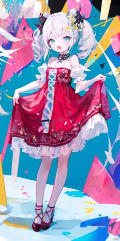 cerulean blue background,1girl, solo, long hair, breasts, looking at viewer, blush, bangs, ponceau red hair, hair ornament, thighhighs, dress, bare shoulders, jewelry, standing, full body, flower, short sleeves, indoors, hair flower, water, necklace, lotus red dress, high heels, lemon yellow thighhighs, white footwear, crossed legs, fishnets, veil, wedding dress, skirt hold, bridal veil, watson cross