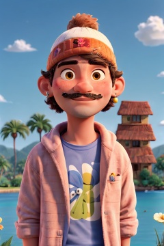 TT, looking at viewer, yellow background, short hair, pink flower, jacket, red flower, mustache,blackeyes,blush,ligne, tree, sailing,palm tree, sky, cloud, day, ocean, outdoors, blue sky, water,hat, black hair, white shirt, earrings, 1boy, leaf, plant, shirt, flower, jewelry, beanie, solo, facial hair, male focus, upper body, cat, food,,迪士尼