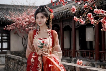 Realistic, photorealistic, masterpiece, best quality, dark shot, (photo of portrait:1.2), (1girl), (straight and round breasts:1.8), solo, smile, looking at viewer, long black hair, Full-body photos, (wearing a red Chinese wedding dress:1.5), (an ancient bride adorned with gold hairpins and silver jewelry), an extremely delicate and beautiful, real person, fair skin, ((Slender and perfect long legs)), ((perfect hands)), plentiful, breasts, (see through:1.5), (blackpantyhose:1.2), (plump chest), (Suzhou Garden:1.3), (cherry blossom trees:1.1), petals, falling petals, petals, falling petals, Lantern, Realistic Scene, Canon D50 Shooting,  wedding gown