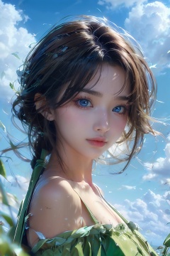 1girl, solo, sky, cloud, long hair, outdoors, day, looking at viewer, grass, blue sky, green eyes, realistic, bare shoulders, brown hair, upper body, dress, plant, green dress, cloudy sky, wind, nose, depth of field, black hair, leaf, freckles, closed mouth, from front