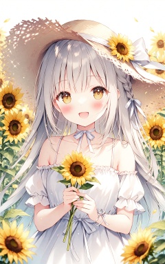 (masterpiece), (best quality), illustration, ultra detailed, hdr, Depth of field, (colorful),weri, 1girl, sunflower, flower, solo, hat, braid, long hair, dress, hat flower, smile, open mouth, looking at viewer, holding flower, white dress, outdoors, yellow flower, straw hat, collarbone, holding, :d, bangs, blurry, short sleeves, off shoulder, off-shoulder dress, petals, bare shoulders, blush, ribbon, blurry background, brown headwear, choker, upper body, sun hat, day, ribbon choker, brown eyes, very long hair, puffy sleeves, yellow eyes, single braid, depth of field, puffy short sleeves, white choker, white ribbon