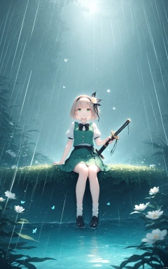 (masterpiece), (best quality), illustration, ultra detailed, hdr, Depth of field, (colorful),Miv4t, 1girl, weapon, solo, sword, konpaku_youmu, katana, hairband, green_skirt, short_hair, skirt, butterfly, rain, shirt, bug, ribbon, flower, short_sleeves, crying, green_vest, hair_ornament, white_shirt, vest, tears, torn_clothes, bangs, black_hairband, sheath, holding, bow, socks, hair_ribbon, green_eyes, shoes, puffy_sleeves, collared_shirt, skirt_set, black_ribbon, sitting, hair_flower, planted, crying_with_eyes_open, water, bowtie, parted_lips