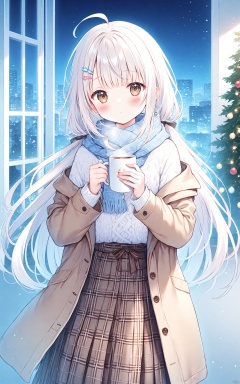 (masterpiece), (best quality), illustration, ultra detailed, hdr, Depth of field, (colorful), hanekoto,しいなまひる(お隣の天使様にいつの間にか駄目人間にされていた), 椎名真昼, Shiina Mahiru, しいなまひる, 1girl, cup, solo, long hair, holding, skirt, looking at viewer, hair ornament, bangs, sweater, hairclip, blush, mug, brown eyes, window, ahoge, plaid, scarf, holding cup, plaid skirt, white sweater, long sleeves, night, closed mouth, jacket, indoors, turtleneck, building, open clothes, standing, long skirt, brown jacket, off shoulder, very long hair, tree, white hair, cityscape, turtleneck sweater, brown skirt