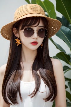 (absurdres, highres, ultra detailed, 1girl, solo, extremely detailed eyes, starfish, seashell, shell, flower, hat, hair ornament, jewelry, straw hat, looking at viewer, sunglasses, hat flower, drinking straw, hairclip, earrings, red flower, tinted eyewear, yellow flower, bangs, english text, multicolored hair, orange flower, black hair, ring, cup, long hair, orange-tinted eyewear, food, brown hair, portrait, shell hair ornament),full body., ((poakl)), poakl ggll girl, Light master, Wuqiii