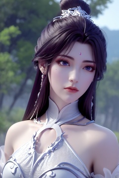 1girl, solo, long hair, blue eyes, brown hair, black hair, hair ornament, dress, bare shoulders, jewelry, closed mouth, upper body, earrings, detached sleeves, hair bun, white dress, facial mark, forehead mark, yuechan<lora:EMS-321311-EMS:0.800000>