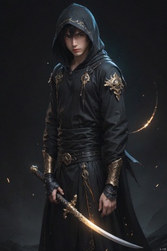 solo, 1boy, holding, standing, weapon, male focus, hood, holding weapon, armor, glowing, glowing eyes, hood up, scythe, holding scythe