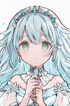 elegant, ethereal beauty, intricate details, flowing fabrics, mesmerizing eyes and captivating face, exquisitely fine and detailed, flawless details, 1 girl, solo, upper body, waist-length hair, gazing into the distance, serene expression, green eyes, ball gown, silver hair, floral crown, off-shoulder sleeves, wavy locks, enchanted forest background, holding a crystal in hand