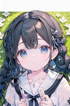 best quality, masterpiece, super details, fine fabrics, high detailed eyes and detailed face, extremely fine and detailed, perfect details, 1 girl, solo, upper body, very long hair, looking at viewer, no expression, blue eyes, sailor shirts, black hair, ribbon hairband, long sleeves, twin braid, outdoor, cityscape background, school bag, holding the envelope, lying on the grass, river