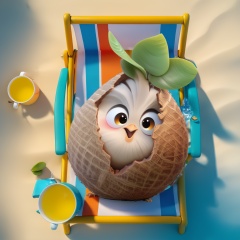 Coconut chicken,The image showcases a whimsical and animated character that appears to be a fusion of a coconut and a Chicken,top view. The character is seated on a striped beach chair, with a cup of yellow liquid, possibly tea or lemonade, beside it. The character has large, expressive eyes and a leafy green sprout emerging from its head. The background is a vibrant shade of turquoise, representing the ocean or a pool, with two lemons floating nearby.<lora:YZJ 3.0-000004:1>