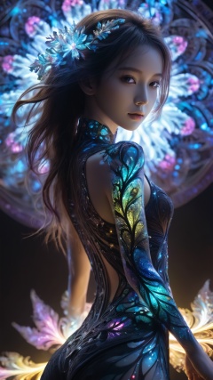 (1girl:1.3),Masterpiece, high quality, 1girl, extreme detailed, (fractal art:1.3), colorful, highest detailed, (chiffon, body painting:1.2), 8k, digital art, macro photo, quantum dots, sharp focus, dark shot, cinematic, Microworld, thigh, (upper thighs shot:1.2), front view,