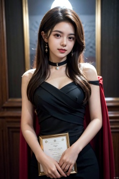 cowboy_shot,(Good structure), DSLR Quality, ,(Front focus),(in the darkness nigth:1.6),Surrealist portraits of women by David HockneyandAlphonseMucha,Fantasyart,photographrealistic,动态照明,artstation,red gown,sam yang, 1girll, ,,黑The eye,brownhair,耳Nipple Ring, jewely,black dressed evening dress, cparted lips, looking at viewert, choker necklace,