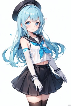 1girl, bangs, black_legwear, blue_eyes, blue_hair, elbow_gloves, gloves, gradient_hair, hat, long_hair, multicolored_hair, neckerchief, sailor_collar, samidare_\(kancolle\), school_uniform, serafuku, shirt, simple_background, sketch, skirt, sleeveless, sleeveless_shirt, smile, solo, swept_bangs, thighhighs, very_long_hair, white_background