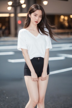 (masterpiece, best quality, full body,ultra high res, photorealistic, realistic, raw photo, real person, photograph), (amazing, finely detail, an extremely delicate and beautiful, sharp focus), 1girl, solo, on the busy street,brown hair , Wide angle, large aperture,(brown mini skirt,standing,Transparent tight shorts,over-the-knee stockings,Short sleeved,,deep v neck),,moyou, nana