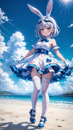 tutututu,1girl,solo,rabbit ears,white dress,white gloves,blue footwear,goggles on head,sleeveless dress,bangs,blue bow,white hair,short hair,white thighhighs,<lora:SY-000010:0.7>,Cute, chubby On a wide stretch of beach in the warm sun, an energetic girl is playing a game of beach soccer. The girl is engrossed in running on the field, In the distance, the blue sky and white clouds reflect the vastness of the sea, and the sea and sky are the same color, which makes people feel refreshed and happy. The sun shone on the girl's body, and her sweat glistened in the sun