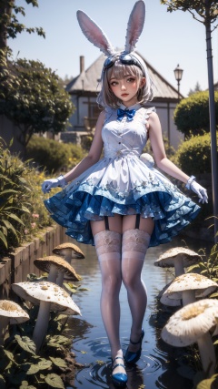 tutututu,1girl,solo,rabbit ears,white dress,white gloves,blue footwear,goggles on head,sleeveless dress,bangs,blue bow,white hair,short hair,white thighhighs,<lora:SY-000010:0.65>,***** Alice in wonderland standing in stream,large mushrooms in background,highly detailed,Beautiful lighting,photoreal,4k,depth of field,night scene,light from godrays shining on ground,