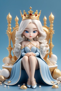 professional 3d model Blindbox, 1girl, white eyes, vampires, one eye closed, white hair, Wearing a golden crown on his head, Sitting on jelly, Pearl and shell embellishments on the ground, Blue gemstone, blue background , sitting, best quality, very aesthetic, 8k, without text, . octane render, highly detailed, volumetric, dramatic lighting