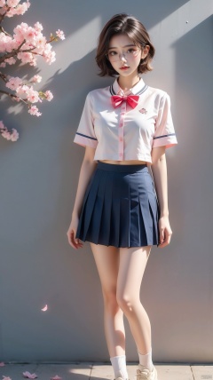 Best Quality, masterpiece, navy blue background, (Pure Blue-16K-1JK, JK, uniform, 1 girl, glasses, blonde short hair, school uniform, pink skirt, sneakers, body, petals falling, cherry blossom background, big breasts