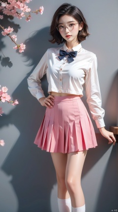 Best Quality, masterpiece, navy blue background, (Pure Blue-16K-1JK, JK, uniform, 1 girl, glasses, blonde short hair, school uniform, pink skirt, sneakers, body, petals falling, cherry blossom background, big breasts