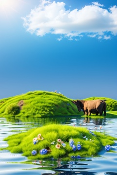 CDCJ, 3D, product photography, still life, flower, outdoors, sky, day, cloud, water, blue sky, no humans, scenery, sun, sheep, cow