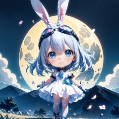 tutututu,1girl,solo,wrist cuffs,rabbit ears,white dress,white gloves,blue footwear,goggles on head,sleeveless dress,bangs,blue bow,white hair,short hair,white thighhighs,<lora:lihaigeQ-000006:0.9>,1girl,(colorful),(finely detailed beautiful eyes and detailed face),cinematic lighting,bust shot,extremely detailed CG unity 8k wallpaper,white hair,solo,smile,((flying petal)),(Flowery meadow),sky,cloudy_sky,building,moonlight,moon,night,(dark theme:1.3),light,fantasy,
