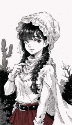masterpiece,best quality, hires,4k,(dark night:1.2),black galaxy starfield,(desert:1.2),forest,sandland,(lineart,black and white ink1.1),Migunov,(monocolor:1.5)girl,solo,(Double braid:1.2),blunt bangs,looking at viewer, (maroon Western skirt),white shirt,(white glove:1.2),(short shawl),leather belt,(classical bonnet),looking at viewer,white background <lora:Migunov2:1.2> <lora:手部优化:1> <lora:增加细节:0.5>
