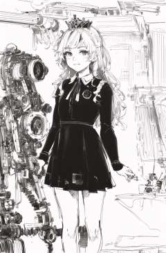 best quality,highres,(sketch,lineart,monocolor,Migunov:1.3)indoors,(Obsolete machine:1.5),(black and white ink art:1.2)young girl,solo,messy hair,flipped long hair, princess skirt,short dress,long sleeves dress, public <lora:Migunov2:1> <lora:public_v3.0-locon:1>