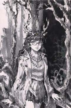 best quality,highres,(sketch,lineart,monocolor,Migunov:1.2),(night forest:1.3),black backgroundgirl,glasses,straight long hair,blunt bangs,portrait, (Sweater coat:1.2),(Beads necklace),(antler on head),(skirt), <lora:Migunov2:1> <lora:darkFantasy_v11:1>