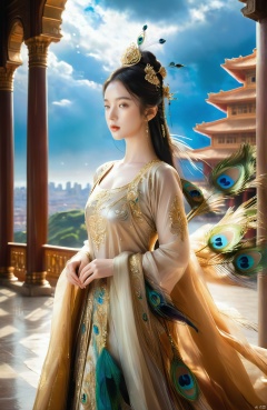 1girl,full body,cloud,sky,cloudy_sky,scenery,architecture,horizon,pillar,1girl,solo,look at the audience,long_hair,girl wearing peacock dress,elegant and graceful beauty,In this breathtaking architectural setting,A towering structure ascends from the terrain,its magnificence reaching out towards the cloudy sky,merging seamlessly with the horizon in an otherworldly ballet.At its foundation, a lone figure stands firm,a girl, exuding elegance and grace in her stance,adorned in a peacock-inspired dress that gleams and flows,her lustrous locks tumbling down like a stream of golden liquid.She fixes her gaze upon us with tranquil self-assurance,her very presence as captivating as the panorama surrounding her.The towering pillars of the majestic edifice stand sentinel behind her,their presence mirroring her own inner fortitude and resilience.This harmonious blend of human beauty and architectural splendor,serves as a testament to both the artist's creative vision and nature's inherent allure.In this instant, she becomes one with the landscape,a living sculpture set against the canvas of the cloudy sky,an emblematic embodiment of poise and elegance amidst soaring architecture., 1girl<lora:EMS-317135-EMS:0.800000>, <lora:EMS-322041-EMS:0.600000>