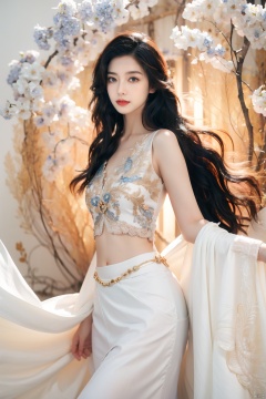 Luxury, beautiful, ultra realistic, ultra clear image quality, 8k, exquisite landscape background, king in the world, domineering empress, enchanting figure, hand placed behind, background with Holy Light Rune flashing, immortal aura diffuse, soft light. The water below shimmered with light. The other shore flower has a large chest, a navel exposed, and black stockings. Official art, unit 8K wallpaper, ultra detailed, beautiful and aesthetically pleasing, masterpiece, best quality, very detailed, dynamic angle, paper skin, radius, radiance, chaotic and most beautiful form, elegant, fauvism design, visual color, romanticism, divine realm In a painting, a girl, stands gracefully, and her presence radiates strength. (Masterpiece, best quality, more details, vertical, realistic, realistic, one detail, clear focus, movie lighting), ray tracing, ultra wide angle, 4K, award-winning,yuyao,1girl,handbag,pencil_skirt,skirt, background blur, simple background,(White clothes:1.6),Chest wrap, clothes without patterns,(Long hair: 1.5),)