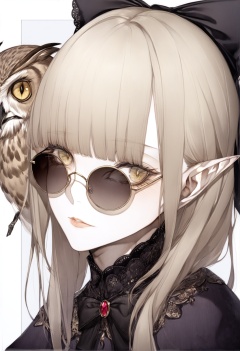 masterpiece, best quality<lora:sd_xl_dpo_lora_v1-128dim:1>,1girl, bird, yellow eyes, owl, pointy ears, long hair , parted lips, solo, blonde hair, hair bow, bangs, sunglasses, portrait, round eyewear, lips, black bow, blunt bangs, slit pupils, animal, eyelashes , <lora:hitoimimXLlokr4f-000053:1>