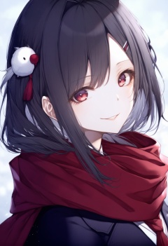 masterpiece, best quality<lora:sd_xl_dpo_lora_v1-128dim:1>,1girl, solo, red scarf, scarf, hair ornament, red eyes, tateyama ayano, smile, looking at viewer, hairclip, portrait, enpera, long hair, bangs, swept bangs, black hair, parted lips, straight-on , <lora:hitoimimXLlokr4f-000053:1>