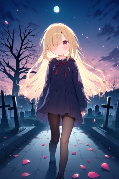 (masterpiece),(best quality),illustration,ultra detailed,hdr,Depth of field,(colorful),loli,1girl,graveyard,solo,long hair,red eyes,tree,cross,tombstone,bare tree,pantyhose,black pantyhose,dress,hood,cloud,hair over one eye,petals,outdoors,cloudy sky,blonde hair,moon,sky,