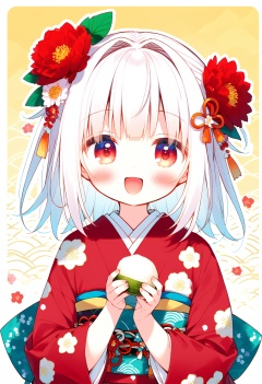 1girl,loli,solo,long hair,looking at viewer,blush,smile,open mouth,bangs,hair ornament,red eyes,long sleeves,holding,upper body,flower,white hair,:d,food,japanese clothes,hair flower,wide sleeves,blunt bangs,kimono,sash,obi,hair intakes,floral print,red flower,red kimono,print kimono,wagashi,egasumi,mochi,