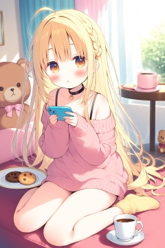 (masterpiece),(best quality),illustration,ultra detailed,hdr,Depth of field,(colorful),loli,1girl,solo,food,cup,phone,sweater,long hair,socks,indoors,no shoes,cellphone,brown eyes,looking at viewer,long sleeves,off shoulder,couch,blush,table,plate,window,bangs,braid,ahoge,stuffed animal,sleeves past wrists,stuffed toy,off-shoulder sweater,saucer,mug,parted lips,blonde hair,on couch,puffy sleeves,choker,puffy long sleeves,sunlight,curtains,smartphone,yellow socks,brown sweater,bare shoulders,day,black choker,blurry,the pose,:o,teddy bear,blurry background,teacup,cookie,full body,very long hair,