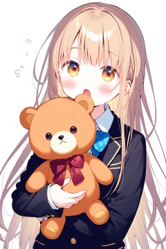 1girl,loli,teddy bear,stuffed toy,stuffed animal,solo,long hair,looking at viewer,bow,food,brown eyes,blush,upper body,open mouth,bangs,school uniform,jacket,doughnut,object hug,bowtie,flying sweatdrops,blazer,jewelry,holding,black jacket,white background,brown hair,shirt,ring,blue bow,red bow,blonde hair,red bowtie,long sleeves,simple background,holding stuffed toy,:o,white shirt,collared shirt,head tilt,doll hug,light brown hair,very long hair,yellow eyes,plaid,