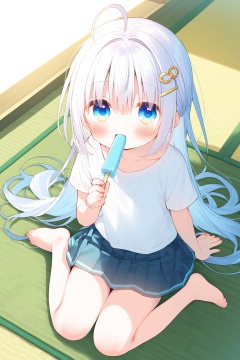 1girl,loli,solo,shirt,long hair,sitting,popsicle,skirt,looking at viewer,white shirt,hair ornament,food,blue eyes,short sleeves,barefoot,holding,hairclip,ahoge,blush,bangs,holding food,wariza,pleated skirt,hair between eyes,blue hair,eating,tatami,very long hair,collarbone,white hair,from above,arm support,