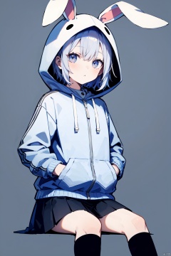 1girl, animal_ears, animal_hood, black_skirt, bunny, bunny_hood, grey_background, hands_in_pockets, hood, hood_up, hooded_jacket, hoodie, kneehighs, long_sleeves, looking_at_viewer, pleated_skirt, rabbit_ears, short_hair, sitting, skirt, white_hair
