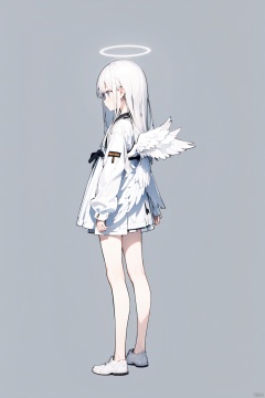 1girl, angel, angel_wings, feathered_wings, full_body, grey_background, halo, insect_wings, long_hair, simple_background, solo, standing, white_hair, white_wings, wings