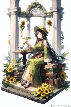 1girl, bird, flower, long hair, grapes, black hair, sitting, solo, green eyes, pillar, fruit, book, hair ornament, food, hat, plant, dress, jewelry, long sleeves, green dress, vase, braid, railing, column, very long hair, book stack, watermark, beads, full body, sunflower, yellow dress, tassel, leaf