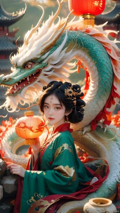 The girl and the Chinese dragon,Chinese dragon,1girl,autumn,Chinese Hanfu,black hair,squama ,The hair on the faucet,Ultimate details,Dragon horn,The graceful and winding dragon body,dragon,Close up, close up,The dragon head is suspended on the girl's head,ancient Chinese architecture,The girl sat on a green stone, sat sideways, looking at the camera, full body,Red Dragon,Open the dragon's mouth,eastern dragon,hair ornament,horns,jewelry,lantern,long hair,new year,paper lantern,sitting,sun,teeth, Chinese dragon
