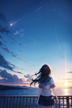 1girl, art_brush, bird, black_hair, blue_skirt, blue_sky, cloud, cloudy_sky, condensation_trail, day, facing_away, from_behind, hill, horizon, kneehighs, long_hair, mountain, ocean, outdoors, railing, scenery, school_uniform, serafuku, skirt, sky, solo, standing, star_\(sky\), summer, sunrise, white_shirt, wind