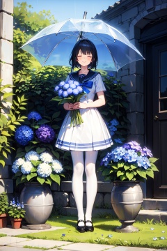 1girl, black_hair, blue_flower, blue_rose, bouquet, closed_eyes, dress, flower, flower_pot, full_body, grass, holding, holding_bouquet, holding_flower, hydrangea, leaf, lily_\(flower\), morning_glory, outdoors, plant, potted_plant, purple_flower, rain, sailor_collar, shoes, short_hair, smile, socks, solo, standing, white_legwear