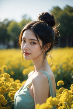 A sexy beauty with a bun, half-body portrait, standing in a sea of rapeseed flowers, charming eyes, sweet smile, surrounded by blooming yellow rapeseed flowers, forming a beautiful picture, high quality picture, full HD picture, 8K resolution, photorealistic, intricate details, sharp focus, vibrant colors, trending on ArtStation, trending on CGSociety, by Greg Rutkowski, Midjourney, Jeremy Mann, Antonio Moro, Ed Blinkey, Atey Ghailan, Studio Ghibli, heart professional majestic oil painting, popular on DeviantArt, concept art, artwork., lvshui-green dress, Light master