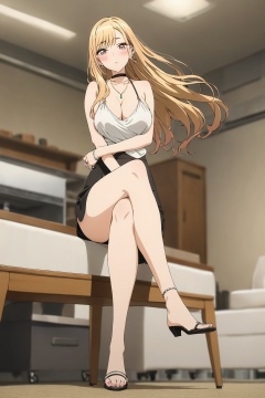 masterpiece,bestquality,kitagawa marin,<lora:kitagawa_marin-000008:0.8>,1girl,solo,black choker,blonde hair,(blurry:1.2),blush,breasts,large breasts,closed mouth,ear piercing,floating hair,jewelry,long hair,necklace,ring,looking at viewer,indoor,full body,crossed_legs,sidesaddle,