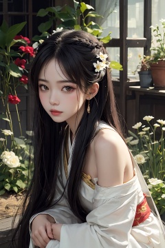 xyx,1girl,solo,long hair,indoor,looking_at_viewer,hanfu,flower field,portrait,bare shoulders,outdoors,