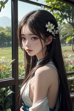 xyx,1girl,solo,long hair,indoor,looking_at_viewer,hanfu,flower field,portrait,bare shoulders,outdoors,