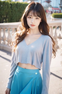 Realistic 32K resolution photo of 1 girl, 1girl, solo, long hair, looking at viewer, bangs, skirt, brown hair, shirt, long sleeves, closed mouth, standing, outdoors, socks, black skirt, blurry, blurry background, blue shirt, pencil skirt, arm behind back, realistic, photo background, Exquisitely perfect symmetric very gorgeous face, perfect breasts, Exquisite delicate crystal clear skin, Detailed beautiful delicate eyes, perfect slim body shape, slender and beautiful fingers:0.9,nice hands, perfect hands, illuminated by film grain, Film photo style, realistic skin, lens flare,