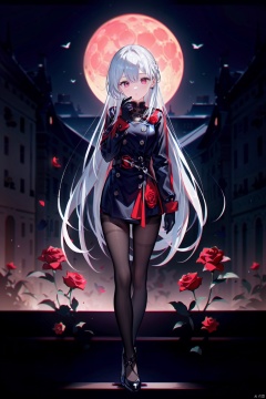 maximalism.fine fabric emphasis, 1girl, ball, earrings, flower, full_body, gloves, jewelry, long_hair, looking_at_viewer, moon, pantyhose, pink_rose, red_eyes, red_flower, red_legwear, red_moon, red_rose, rose, solo, standing, very_long_hair, white_hair,