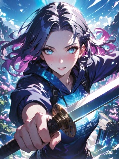 masterpiece,best quality,a girl holding a sword,in the style of dark azure and light azure,mixes realistic and fantastical elements,vibrant manga,uhd image,glassy translucence,vibrant illustrations,