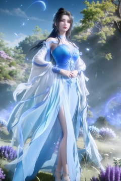 (8k, RAW photo, best quality, masterpiece:1.2),hatching (texture),skin gloss,light persona,artbook,(high detailed skin),glossy skin,contrapposto,female focus,model,(hot:0.7),sexy,fine fabric emphasis,wall paper,fashion,Lipstick,official art,extremely detailed CG unity 8k wallpaper,(ultra-fine painting,extreme detail description,Professional,Vivid Colors,an extremely delicate and beautiful,official art,sweet and delicate girl,delicate facial features,perfect bright figure,surrounded,Bright,romantic long hair,natural light,warm and sweet, blurry,dappled_sunlight,depth_of_field,eyelashes,fireflies,forest,grass,hair_ornament,hydrangea,motion_blur,nature,outdoors,purple_flower,rain,tree,tree_shade),(blue theme:1.6),depth of field,blue circle,1girl,solo,very long hair,hair ornament,jewelry,red lips,makeup,footwear,necklace,single hair bun,lip oil,glowing eyes,watery eyes,blue_dress,chinese clothes,long_dress,very_long_skirt,long skirt,looking at viewer,expressionless,standing,upper body,slender legs,narrow waist,lmw-hd,<lora:0304李慕婉删减加场景:0.8>,ll-hd,<lora:1111白皙质感:0.5>,ty-hd,<lora:0110田野:0.6>,<lora:0223皮肤lora-000001:0.3>,